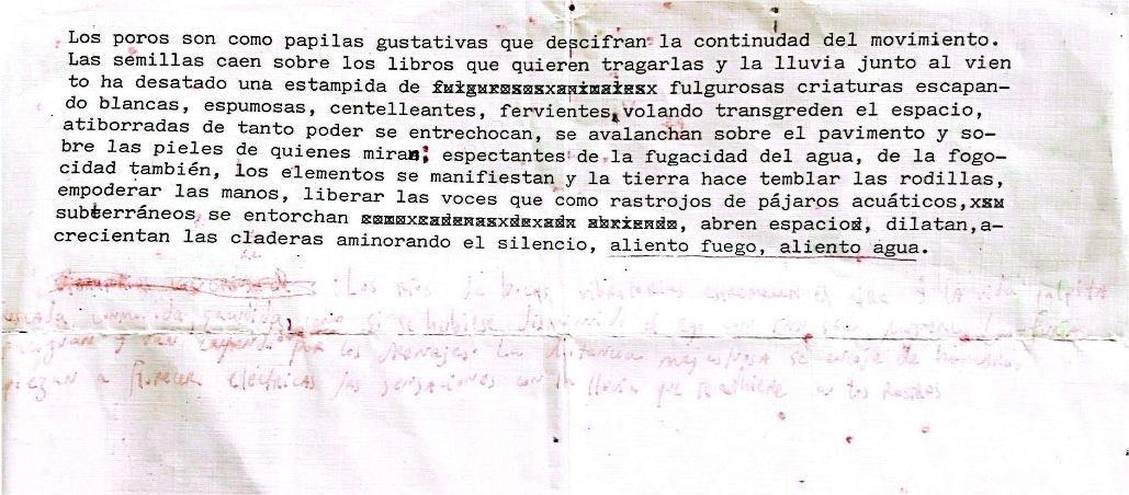 Los poros son como papilas gustativas que descifran la continuidad del movimiento. Las semillas caen sobre los libros que quieren tragarlas. Y la lluvia junto al viento, ha desatado una estampida de fulgurosas criaturas escapándose blancas, espumosas, centelleantes, fervientes. Volando transgreden el espacio. Atiborradas de tanto poder se entrechocan, se abalanzan sobre el pavimento y sobre las pieles de quienes miran: expectantes de la fugacidad del agua, de la fogosidad también. Los elementos se manifiestan. Y la tierra hace temblar las rodillas. Empoderar las manos. Liberar las voces que como rastrojos de pájaros acuáticos, subterráneos; se entorchan, abren espacio, dilatan, acrecientan las calderas, aminorando el silencio... aliento fuego, aliento agua… Los ríos de bocas vibratorias estremecen el aire. Y la vida palpita refrescada, conmovida, sacudida; como si se hubiese disminuido el ego con tan sólo mojarlo. Las furias se apaciguan y van cayendo de a poco por los drenajes. La distancia majestuosa se encoge de hombros y empiezan a florecer eléctricas las sensaciones con la lluvia que se adhiere a los rostros.